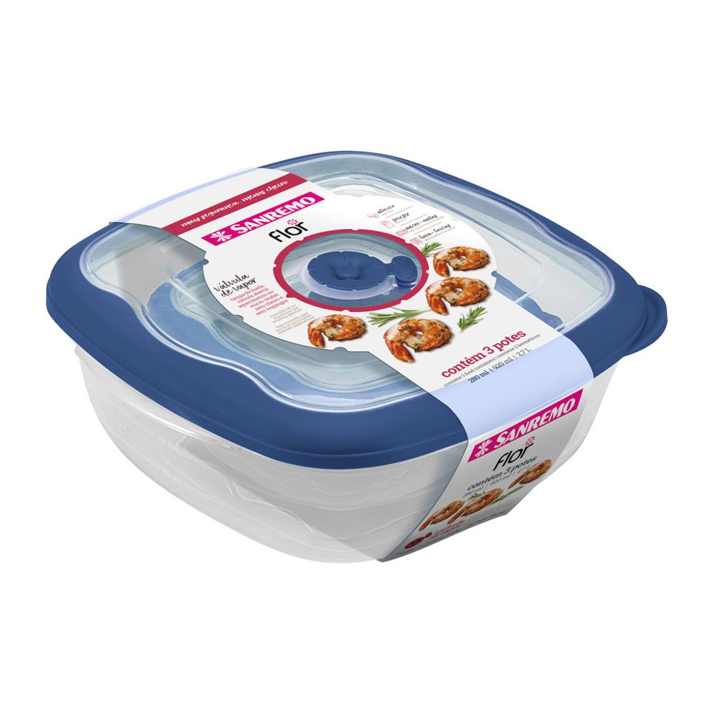 Kit 3 Potes Plásticos Quadrados Herméticos Azul 280ml, 920ml, 2,7L Flor Sanremo
