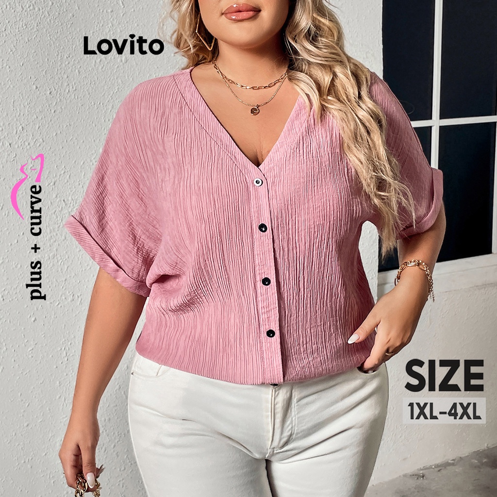 Lovito Blusa Casual Simples Com Botão Frontal Básica Plus Size Para Mulheres LNE31062 (Rosa)
