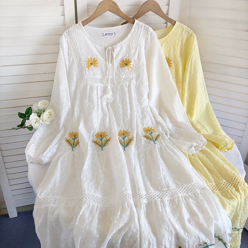 2023 Verão Novo Estilo Coreano Algodão Maxi Vestido Doce Elegância Bordado Primeiro Amor Férias Super Fada Solto