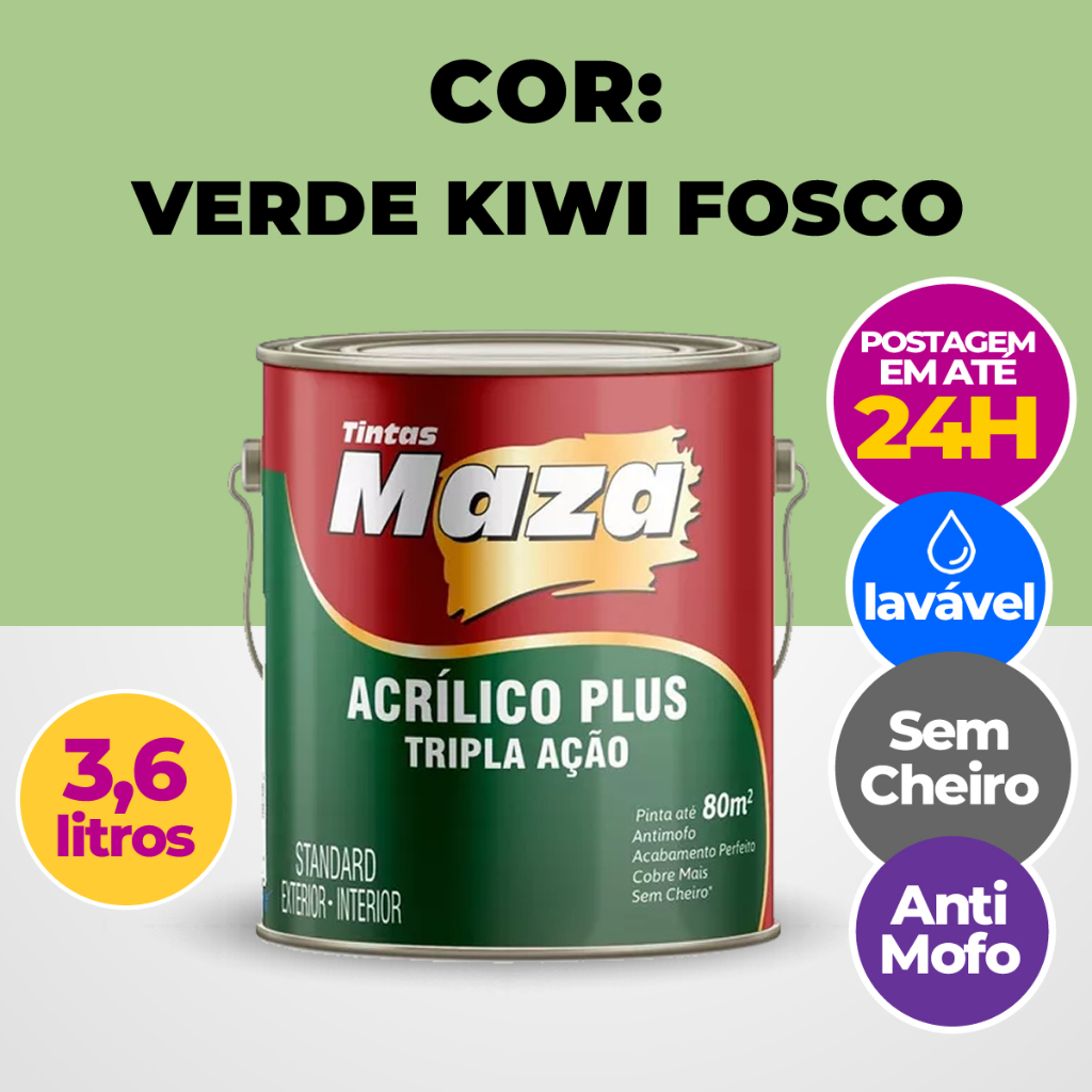 Tinta Acrilica Plus Antimofo Sem Cheiro Fosco Cor Verde Claro Kiwi 3,6 litros Maza Interior e Exterior para Parede Reboco Concreto Gesso Fibrocimento Drywall Texturas Quarto Sala Escritório Fachada