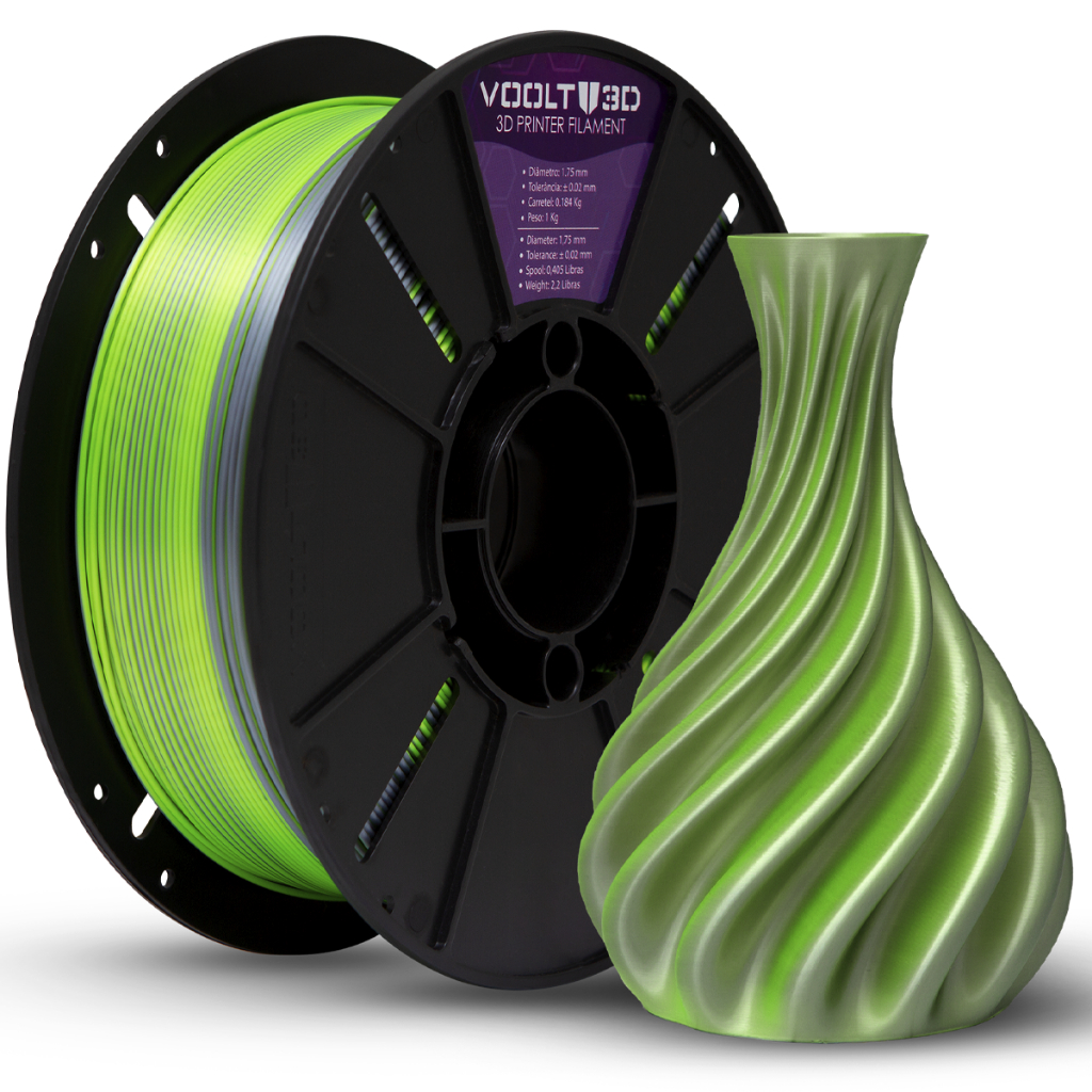 Filamento PLA Duo Color Prata e Verde Neon Premium 1Kg Duas Cores V-Silk 1,75mm Para Impressora 3D - Voolt3D Oficial