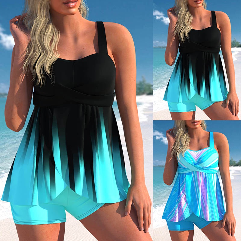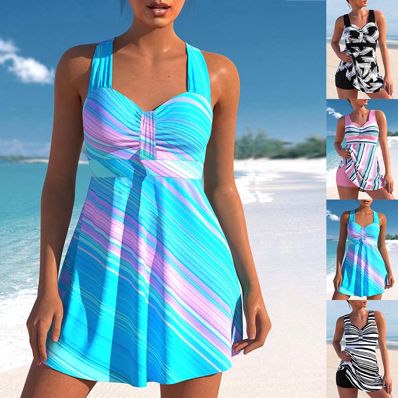 Feminino moda vintage azul praia roupa de uma peça maiô fita biquíni com saia vestido beira-mar