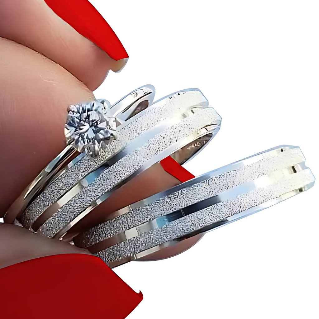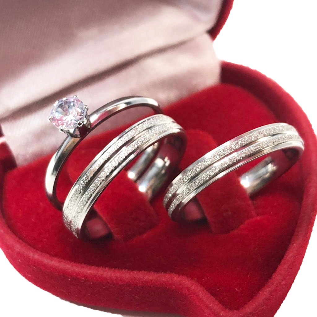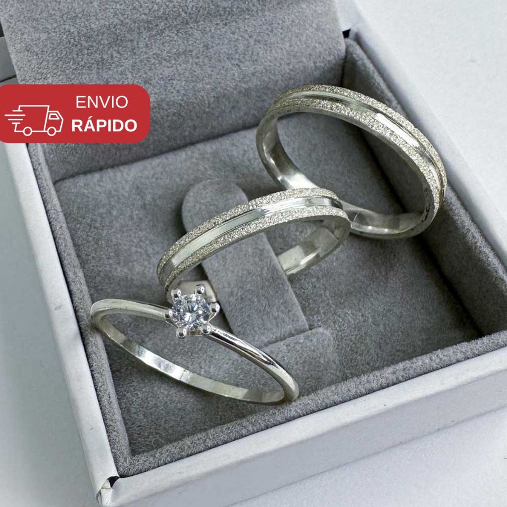 Par de Aliança De Namoro Prata 3mm Dois Frisos Diamantada + Solitário Anel Compromisso Aço Inox 316L