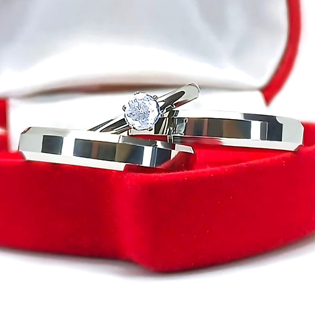 Anel de Namoro Par Aliança Compromisso Solitário e Caixa de Veludo Noivado Chanfrada Aço Inox Prata