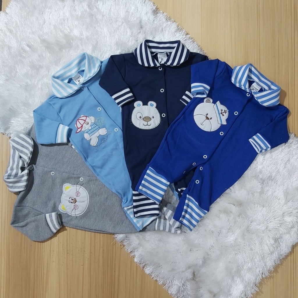 Kit C/4 - Macacão de Bebe Suedine Vira Pé Bordado Menino