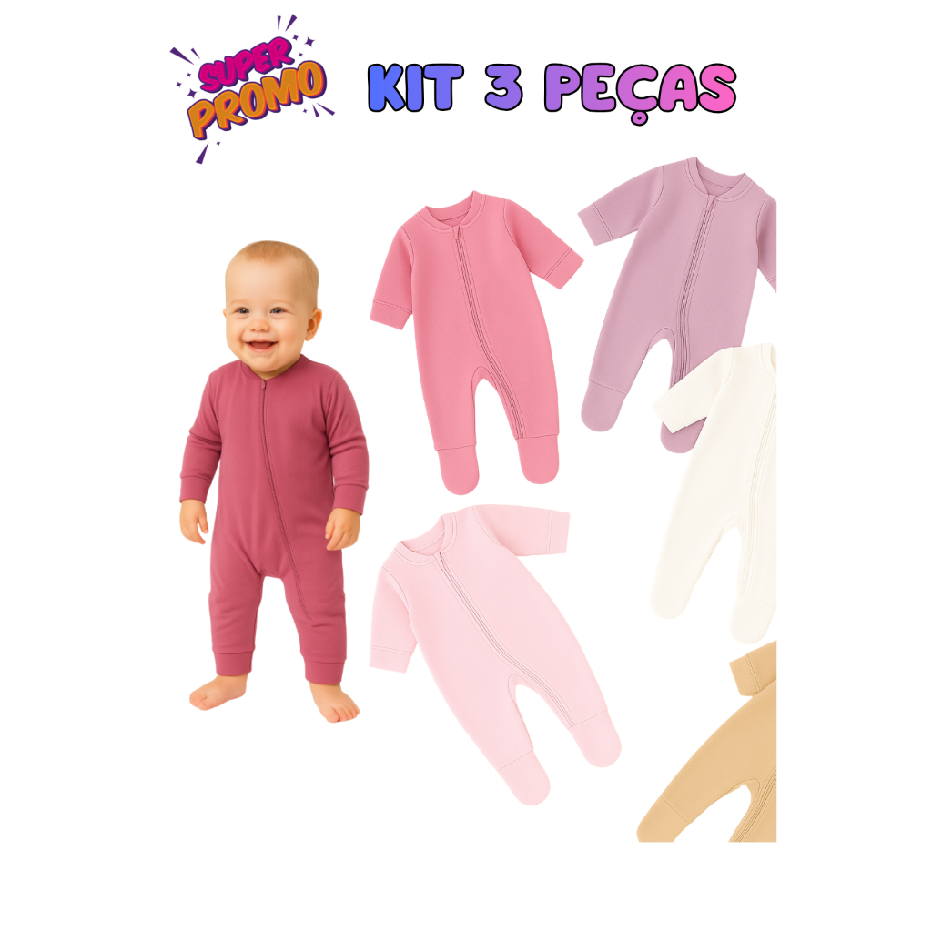 KIT 3 MACACÃO CANELADO VIRA PÉ COM ZÍPER PARA BEBÊ MENINA - ACONCHEGO E ESTILO PARA AS PEQUENAS