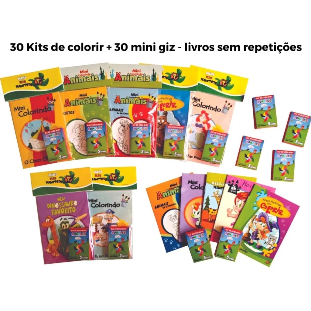 30 Kits Livros De Colorir / Atividades Variados + 30 Mini Giz de Cera 5 Cores Embalados Lembrancinhas Brindes Festas