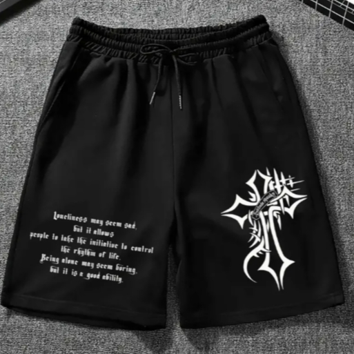 Shorts Moletom Bermuda de malha preto casual masculino Cruz Branca Escritas Modelo Gotico Algodão