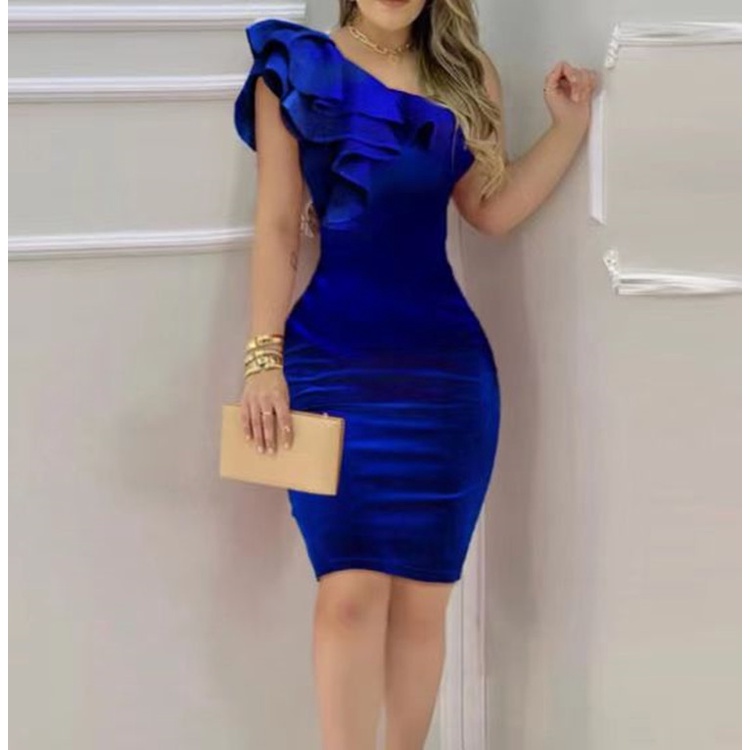 Mini vestido curto feminino sem mangas oblíqua pescoço babado veludo azul bodycon para a noite de festa do clube