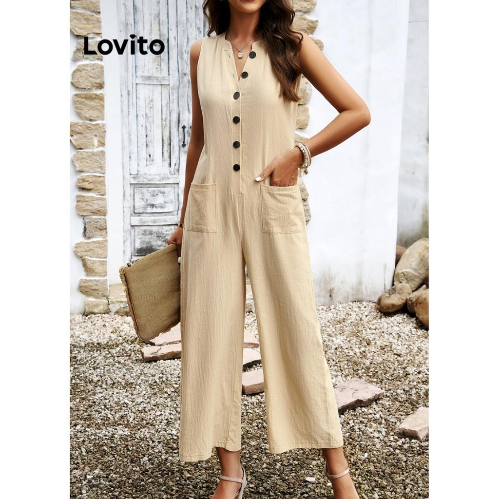 Lovito Macacão Casual De Bolso Com Botão Liso Para Mulheres LNL39079 (Cáqui/Marrom/Verde Claro/Preto)