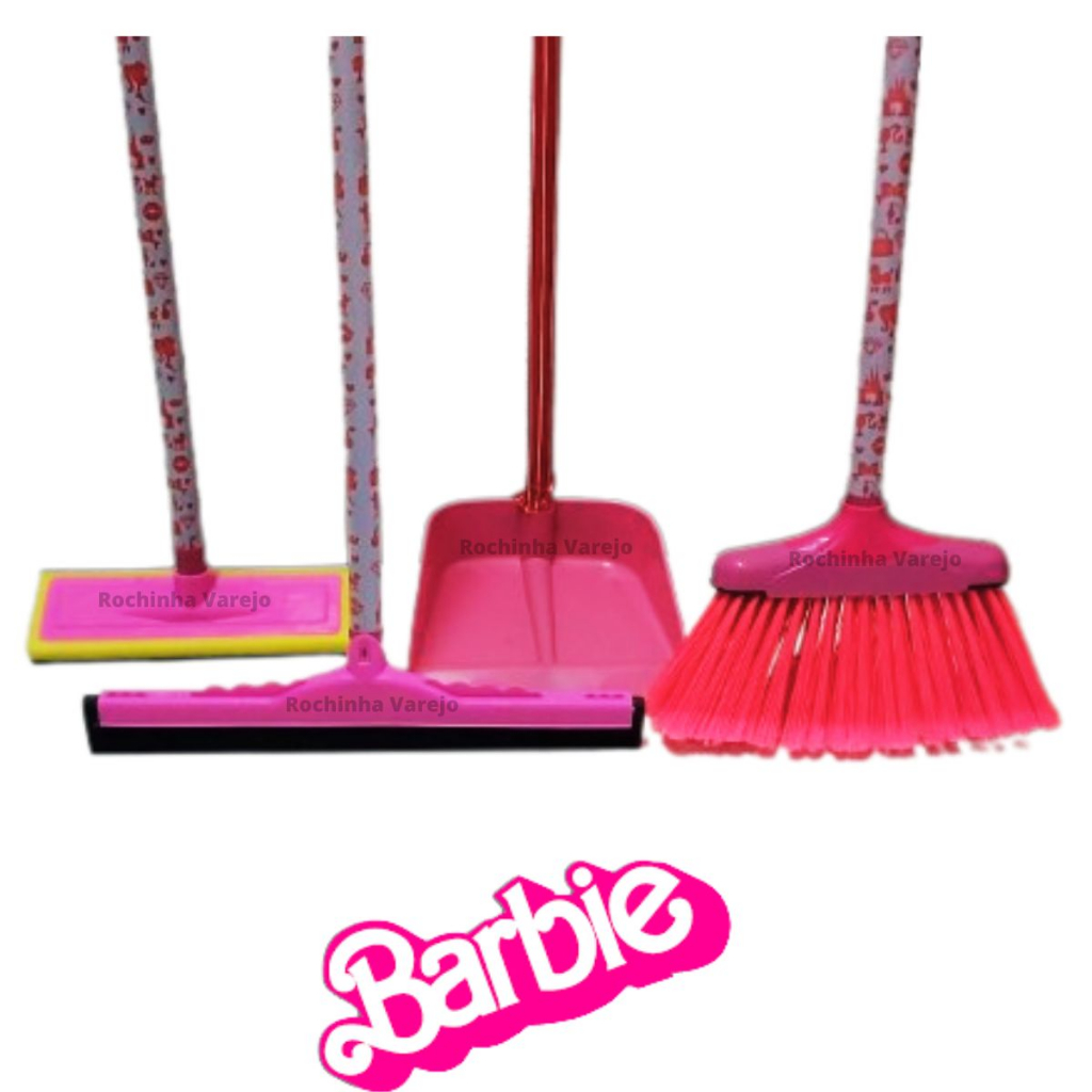 Kit Rosa Barbie Vassoura com Cabo, Rodo Duplo 40cm com Cabo, Esfregão Lava Azulejo com Cabo, Pá de Lixo com Cabo Kit todo Rosa