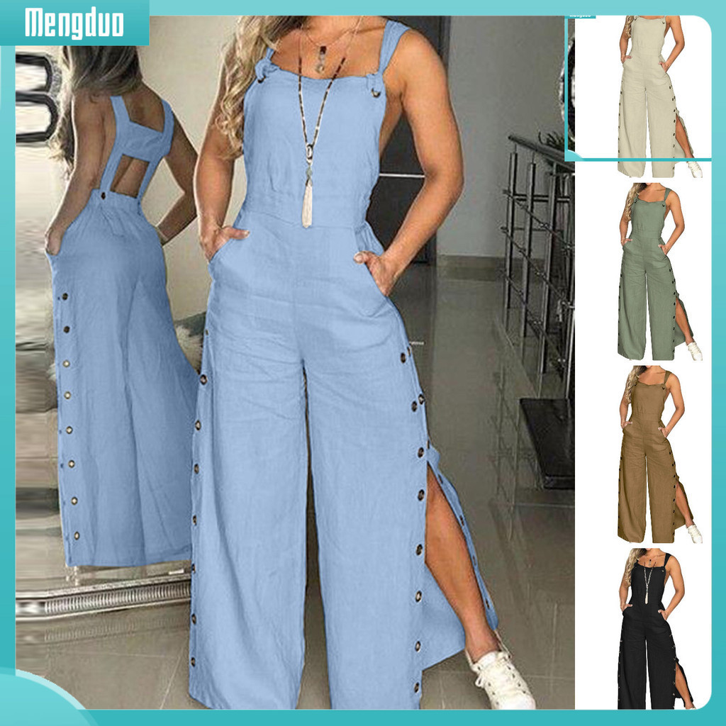 Macacão Feminino De Perna Larga Sem Mangas Com Bolsos Laterais E Fechamento De Botões Cor Sólida Romper Direita Solta Para Mulheres Meninas Roupa De Verão