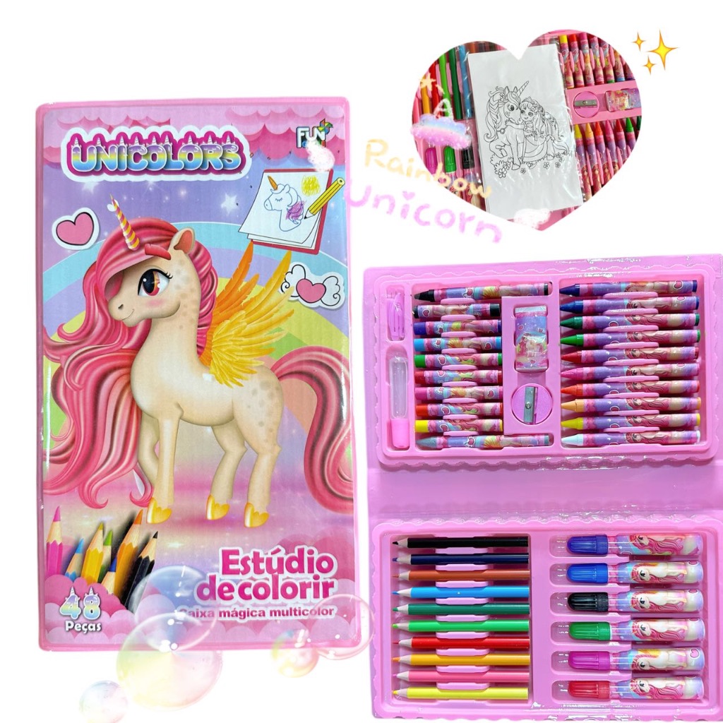 Maleta Escolar de Pintura Infantil 48 Peças Estojo Completo Unicórnio Rosa Caixa multicolor Menina +6