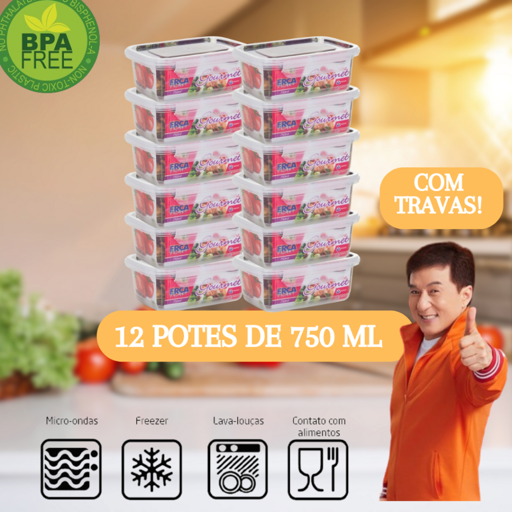 Kit 12 Marmitas Fitness 750ml Para Freezer E Microondas Potes Plásticos com Trava