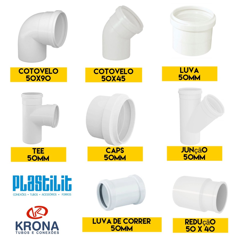 Conexões de Esgoto KRONA Água 100MM - Joelho 45° e 90°, Junção Simples, Luva de Correr, Luva Simples e Tee