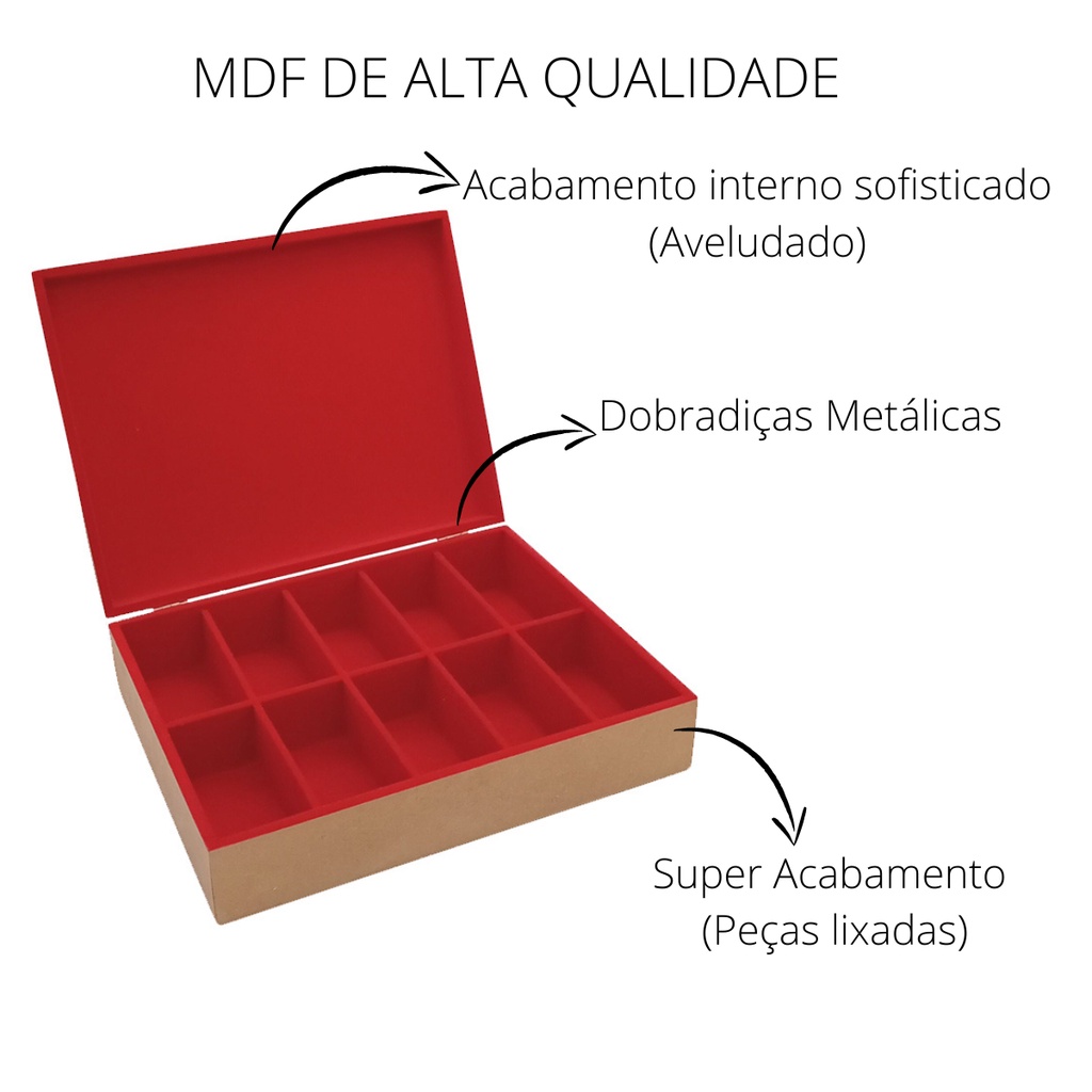 Caixa Relógio Flocada Com Dobradiça 10 Divisórias 30x23,5x7,5 - MDF Madeira