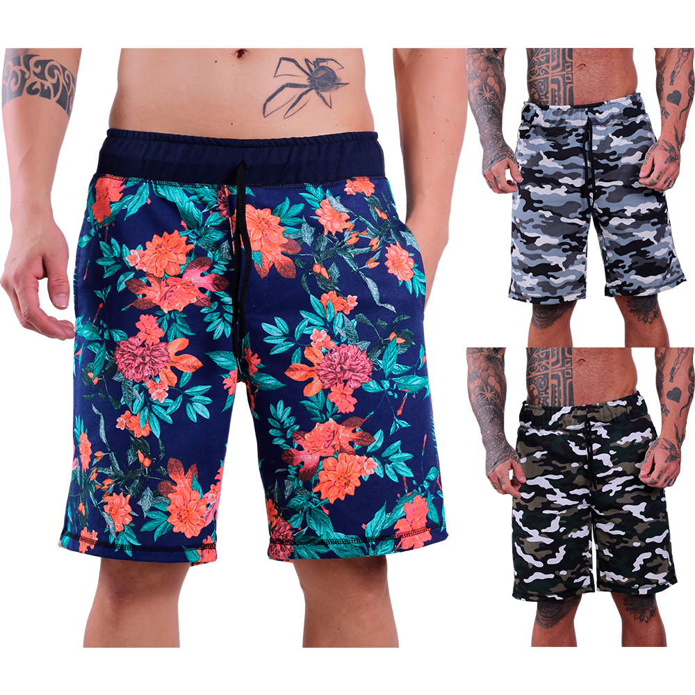Kit 3 Bermudas Masculinas MXD Conceito em Moletom ou Moletinho Cores Fullprint Floral Marinho, Camuflado Verde, Camuflado Cinza Sem Pelucia