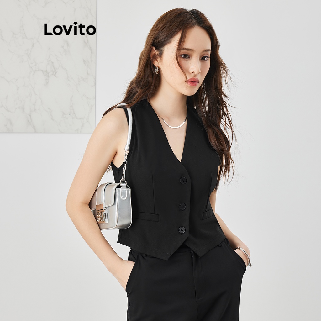 Lovito Regata Casual Simples Com Botão Frontal Decote Em V E Sem Mangas Para Mulheres L47AD021 (Preto)