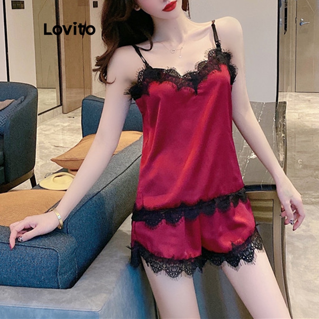 Lovito Sexy Conjunto de Pijama Feminino Liso Sem Mangas com Babado e Gola V LNE07050 (Vermelho)