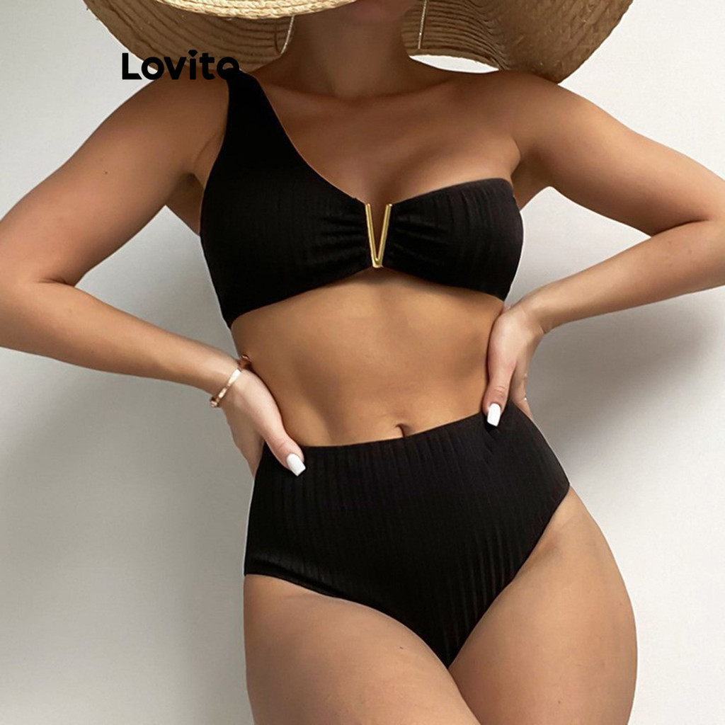Lovito Tops De Biquíni Redondos Assimétricos De Metal Com Textura Lisa Sexy Para Mulheres LNL36155 (Preto)