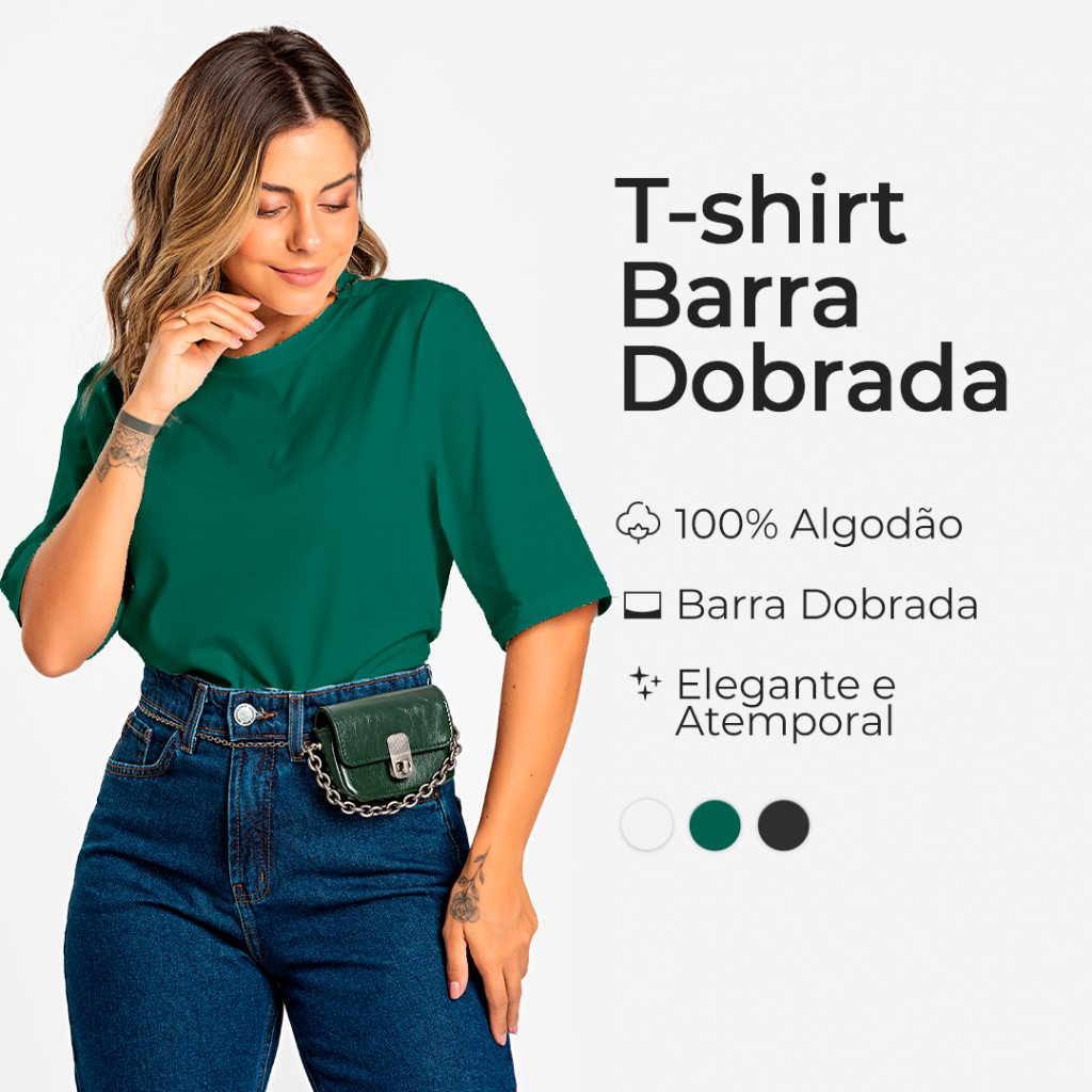 T-Shirt Feminina Barra Dobrada 100% Algodão, Blusa Casual Básico Liso Elegânte - Moda Blogueirinha