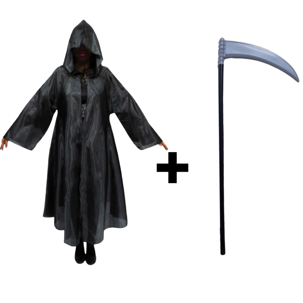 Fantasia Halloween Capa Morte Com Capuz E Foice Mago Pânico Adulto