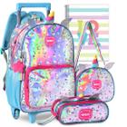 Kit Mochila Infantil Unicórnio Rodinhas Menina Escolar Lindo Lancheira Estojo Holográfica