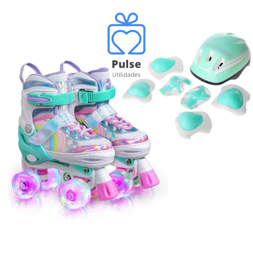 Patins Quad Lindo Tam. Ajustável + Kit Proteção Rodinhas Led