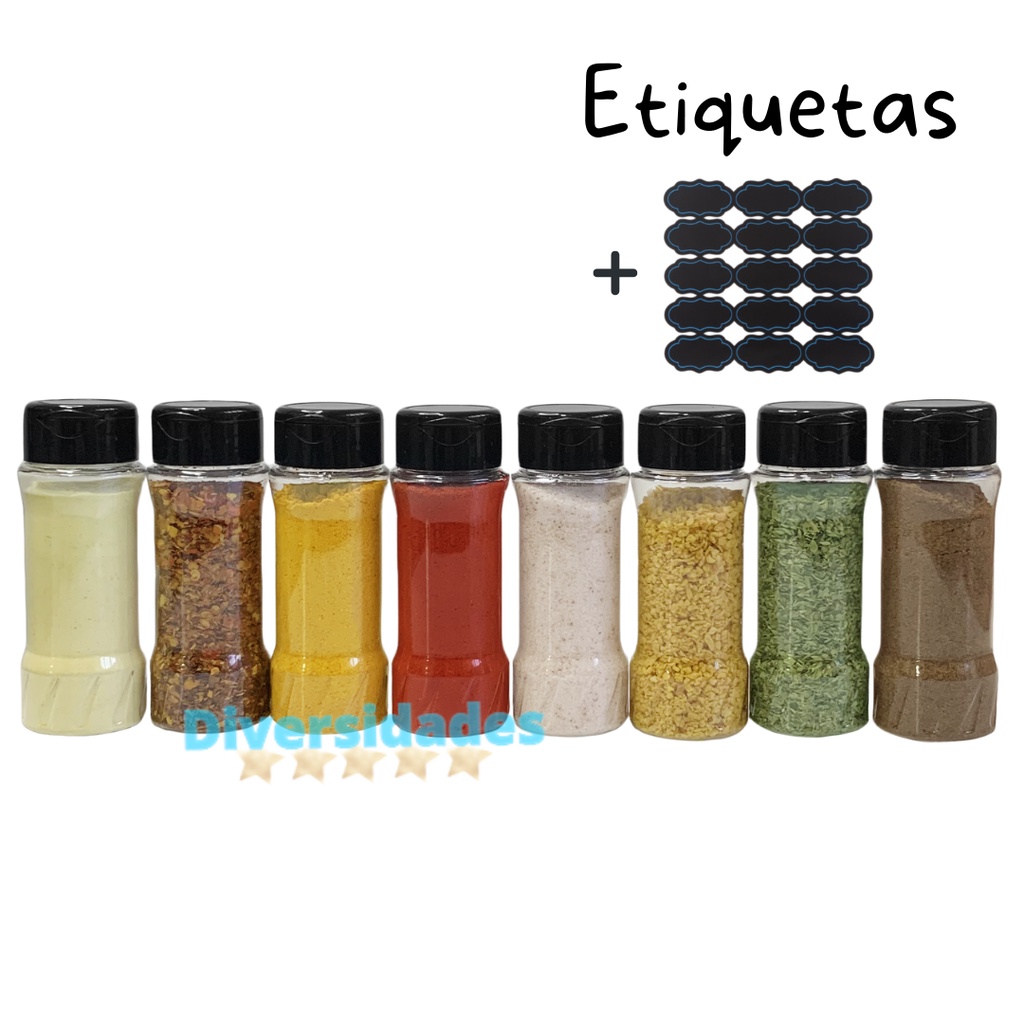 Kit 10 Potes de Plástico Tempero Condimento com Tampa Dosadora Única Com Etiquetas