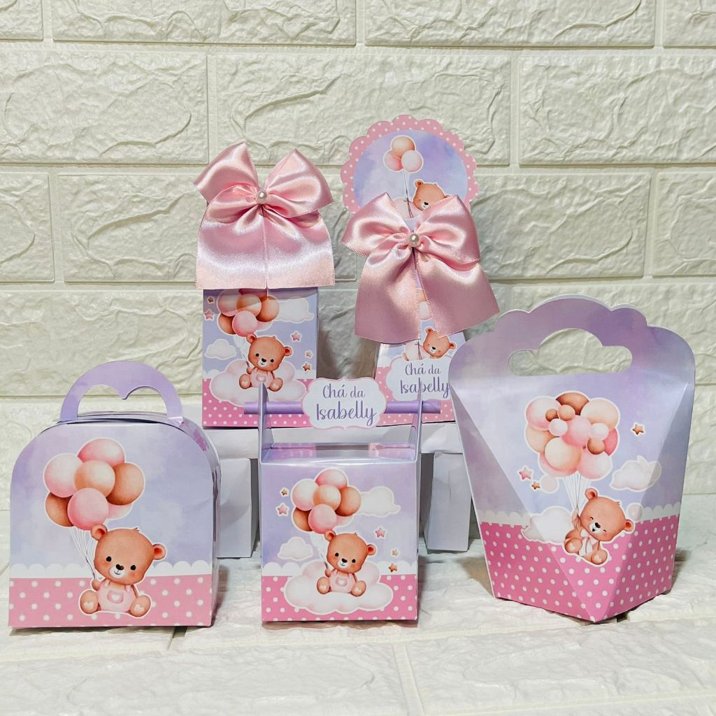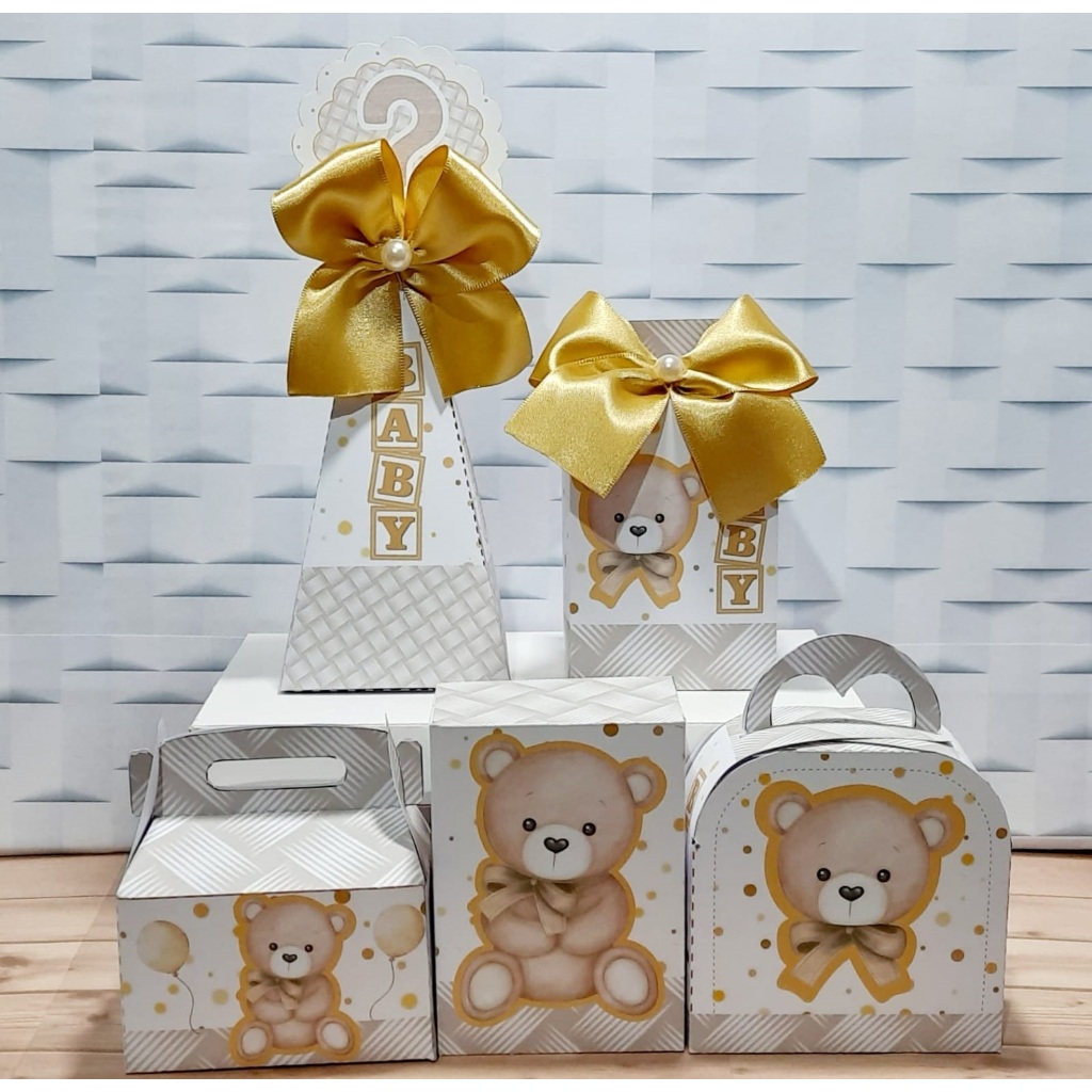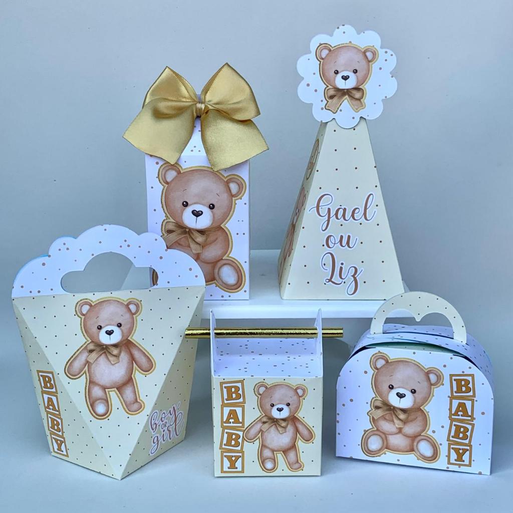 Kit Caixa Personalizados chá Revelação Ursinho Dourado - Caixinhas para Festa de Aniversário - Mimos - Lembrancinha Bêbê