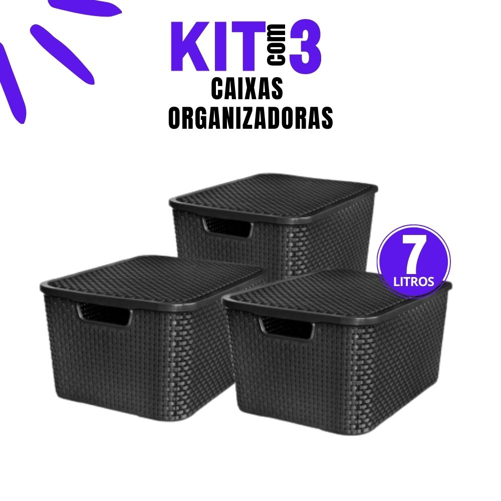 Kit Com 3 Cesto Caixa Organizadora Rattan Com Tampa 7 Litros Preto