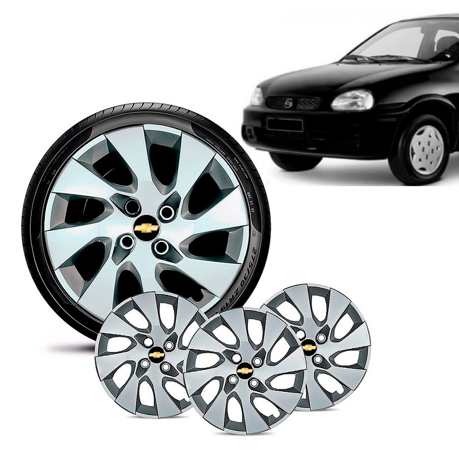 Jogo 4 Calota Chevrolet GM Corsa Wind Aro 13 Prata Emblema Preto