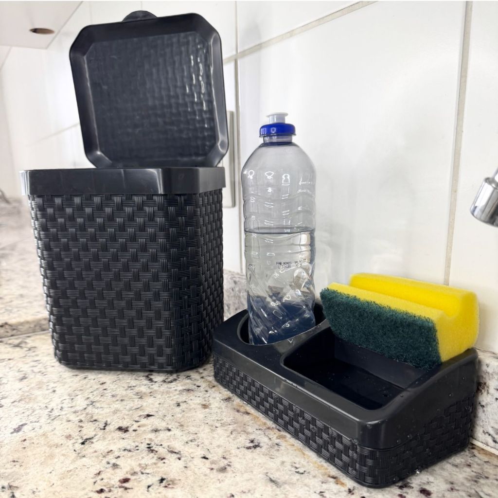 Jogo de Pia Rattan Com Lixeira 05 Litros Porta Detergente com Porta Esponja e Rodinho de Pia Preto
