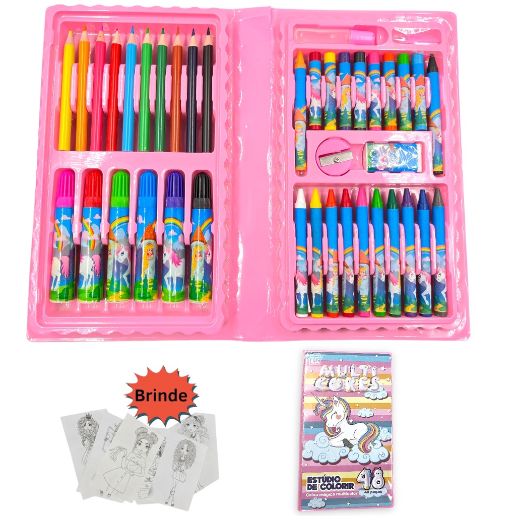 Kit pintura 48 peças Estojo Maleta Pintura Infantil Canetinhas Giz Lápis Cores e Tamanhos Variados + Desenhos Para Colorir Presente infantil