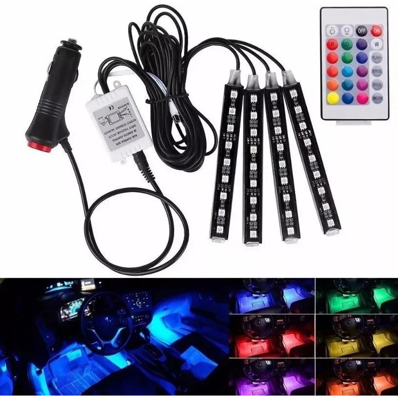 Kit Para Iluminação Interior Carro Luz Led Rgb C/controle Sensor Rítmico 12v 4 Faixas de Luz