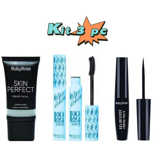 KIT 3 Pecas Primer Facial Ruby Rose Skin Perfect HB8086 + Delineador Liquido Ruby Rose HB8406+Máscara de Cílios Boca Rosa
