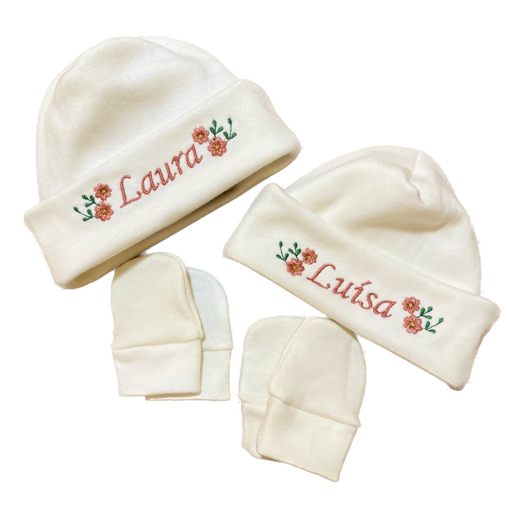 Kit com 02 toucas personalizadas para recém nascido RN com 02 pares de luvinha