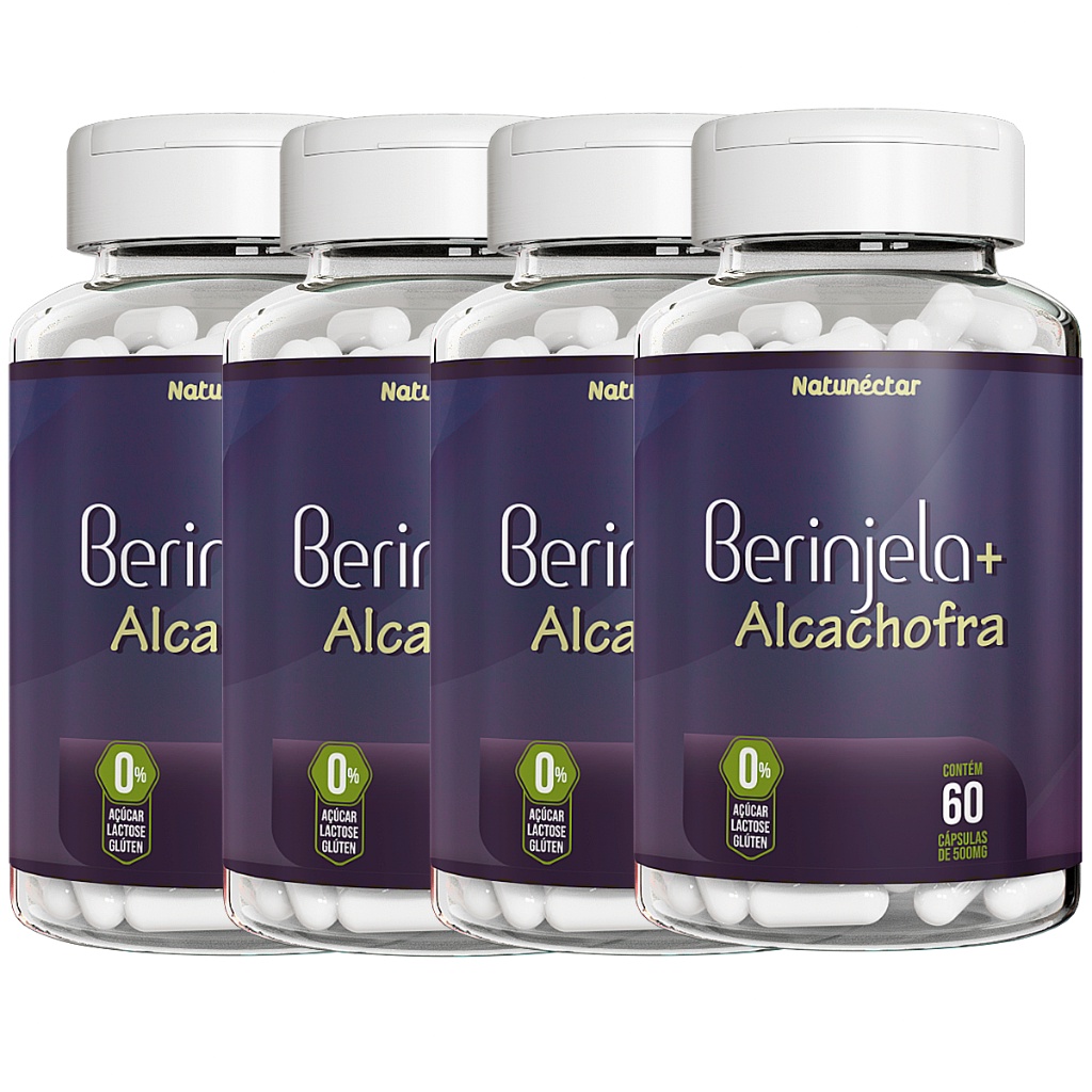 Kit 4 Potes Berinjela com Alcachofra Suplemento Alimentar Natural 100% Pura - Natunectar 240 Capsulas 500mg