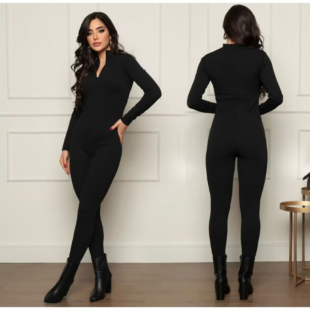 Macacão Longo Feminino Preto Canelado Roupas Gringa Com Ziper