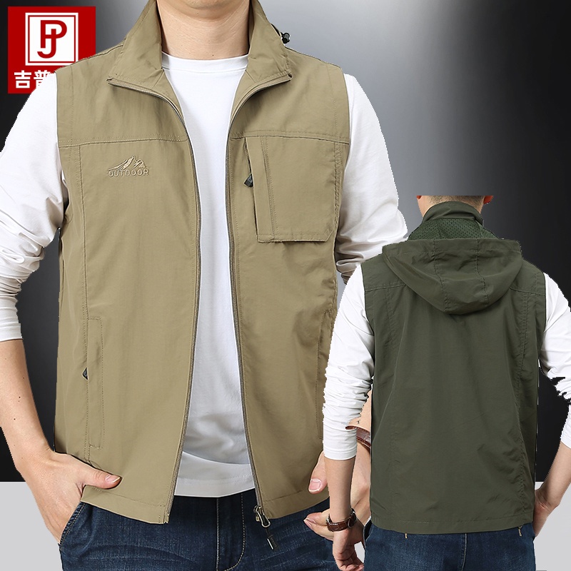 Colete de Trabalho de Outono Estilo Fino com Capuz Fino Colete de Secagem Rápida Homens Casual Cor Sólida Casaco Esportivo Tamanho Grande Colete Juvenil de Idade Média T
