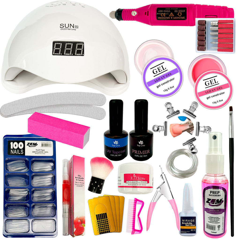 Kit Alongamento de Unha Gel Lixa Lixadeira Motor Completo Acrigel Manicure Top e Primer Fibra Cabine Sun 5 Unhas Gel Manicure