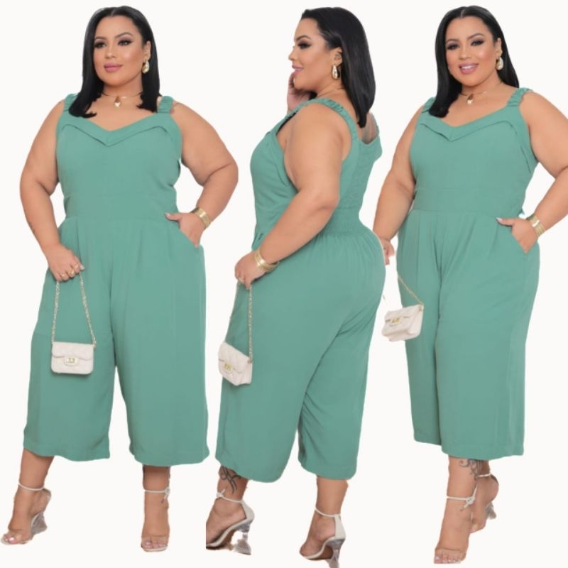 Macacão Pantacourt Femenino Plus Size Viscolinho Alça com Elastico Decote V Elastex 48-52 Plus Size Moda Gordinha