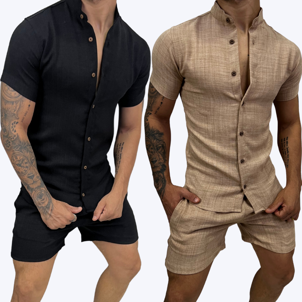 Conjunto Camisa Social com Gola Padre e Bermuda de Linho Masculino Mauricinho Premium
