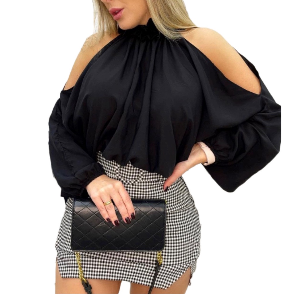 Blusa Feminina Social Cropped Manga Longa Bufante Gola Alta