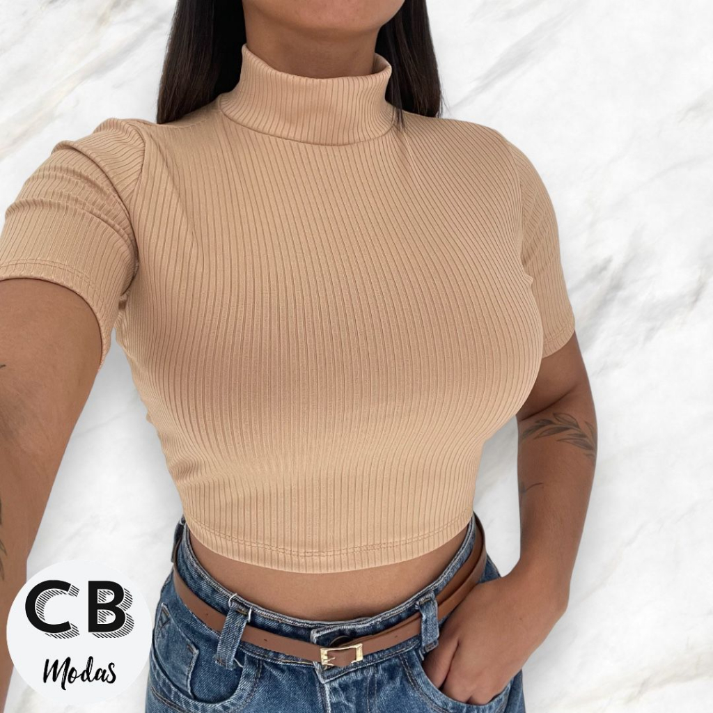 Blusa Feminina Cropped Cacharrel Canelado Gola Alta Manga Curta