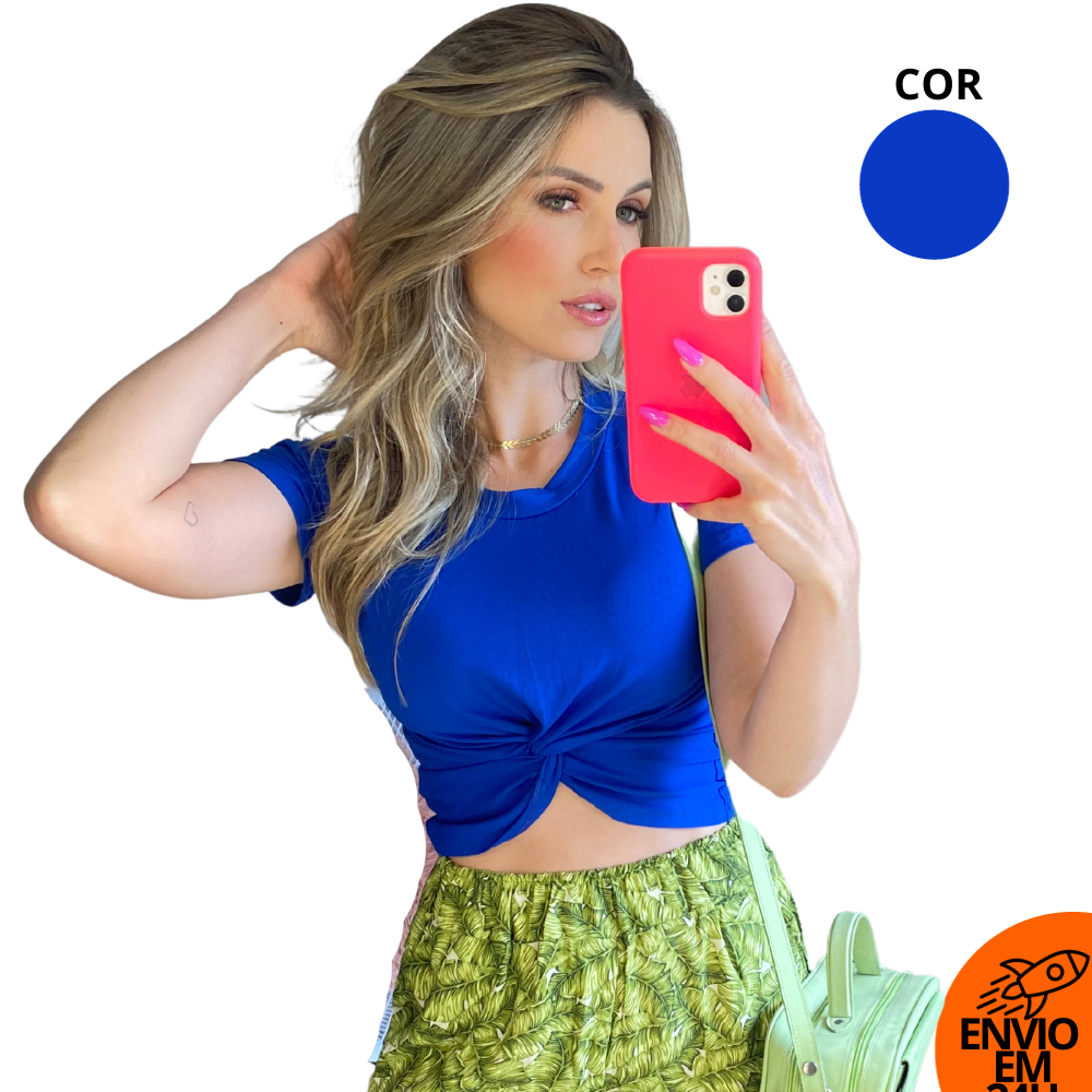 Blusa Feminina Santorini Simples Básica Manga Curta Blusinha Cropped Nó Croped Cruzado - AZUL