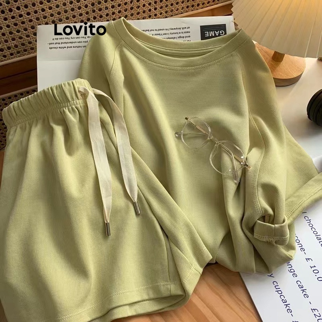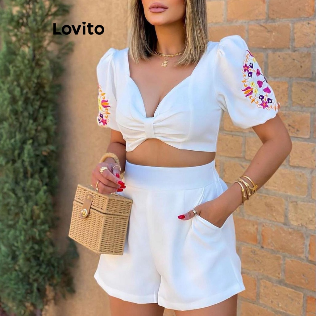 Lovito Casual Conjunto Feminino Liso de Shorts com Bordado Nó e Desenho LNL41058