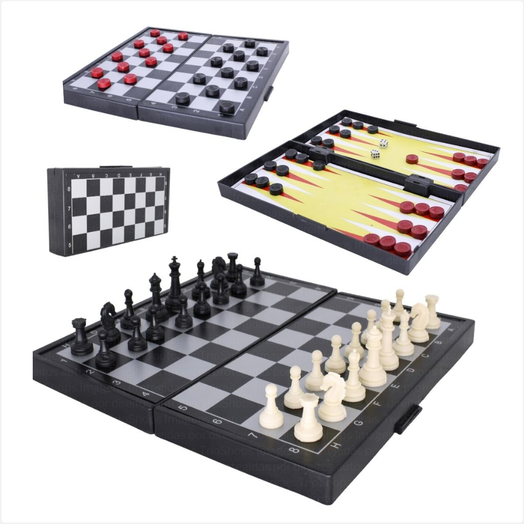 Jogo Tabuleiro Xadrez Dama e Gamão Maleta 3 em 1 de Madeira