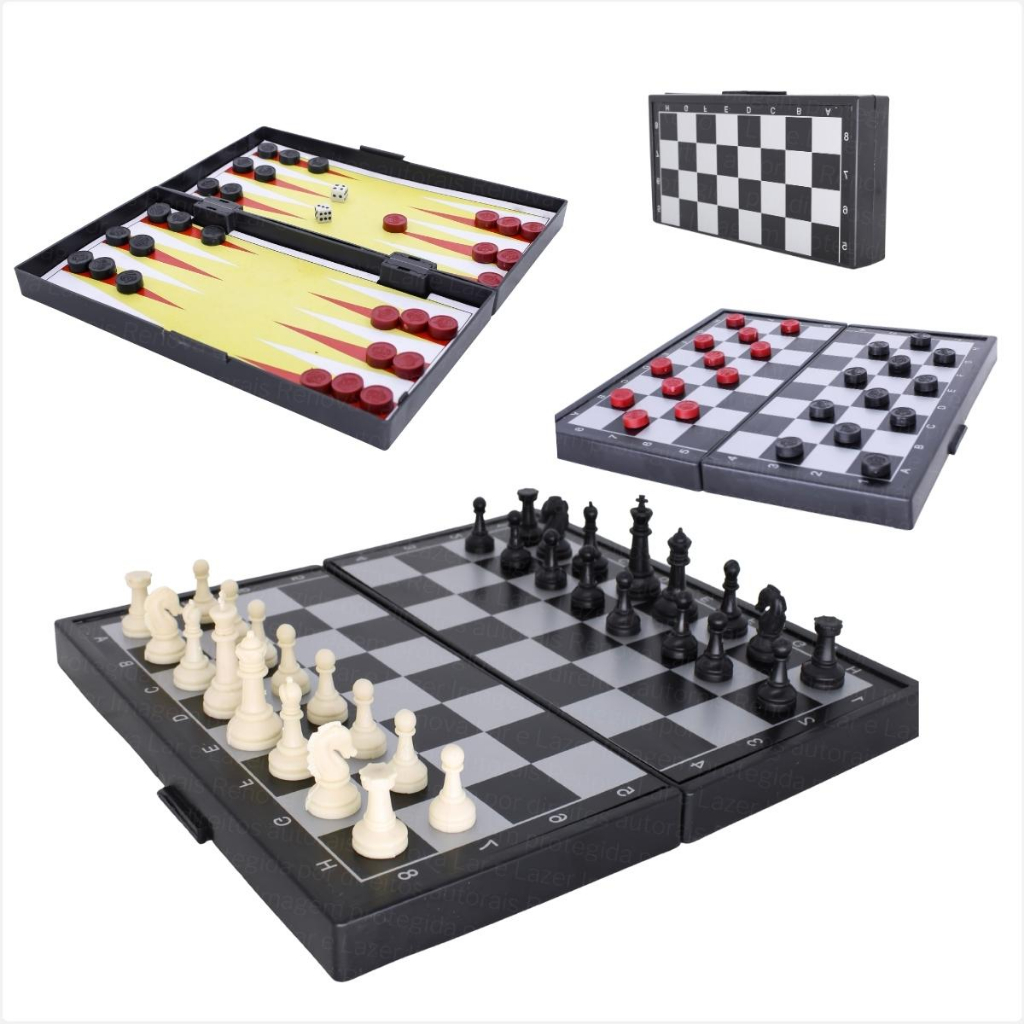 Jogo de Tabuleiro 3 em 1 Xadrez Dama e Gamão Médio