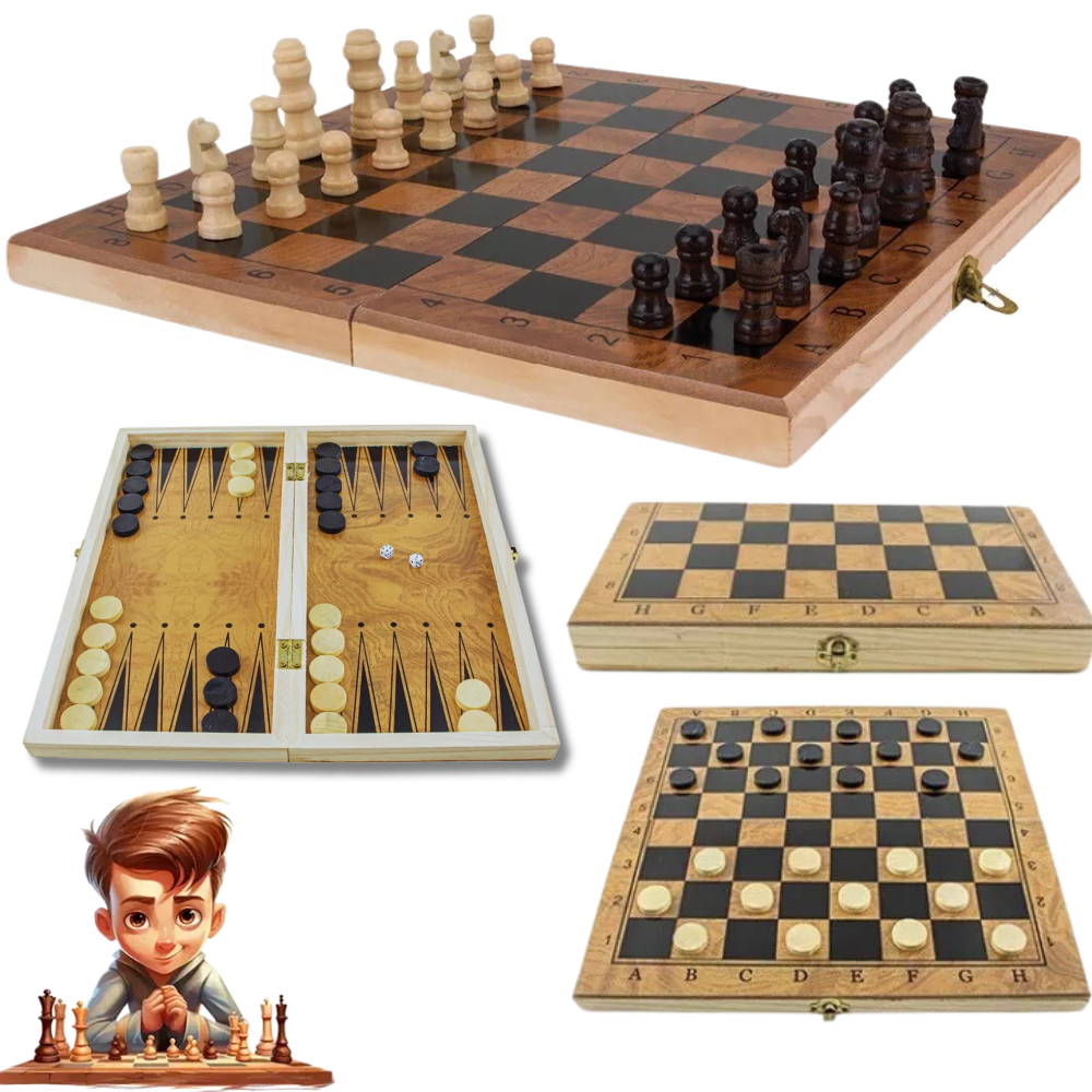 Jogo de Xadrez, Damas e Gamão em Maleta 3 em 1 de Madeira - Conjunto Completo para Estratégia e Diversão - Tabuleiro Portátil de 23,5cm - Peças Clássicas de Xadrez e Damas - Design Elegante e Durável - Ideal para Viagens e Presentes de Qualidade.